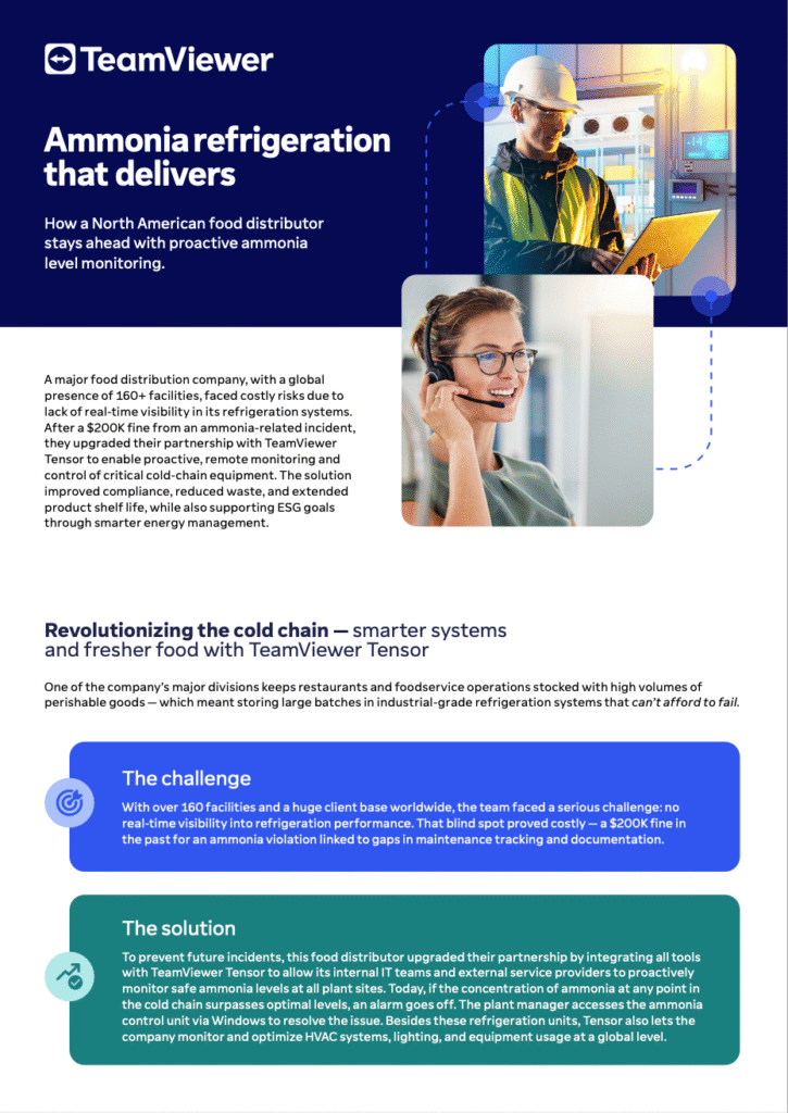 A major food distribution company, with a global presence of 160+ facilities, faced costly risks due to lack of real-time visibility in its refrigeration systems. After a $200K fine from an ammonia-related incident, they upgraded their partnership with TeamViewer Tensor to enable proactive, remote monitoring and control of critical cold-chain equipment. The solution improved compliance, reduced waste, and extended product shelf life, while also supporting ESG goals through smarter energy management.