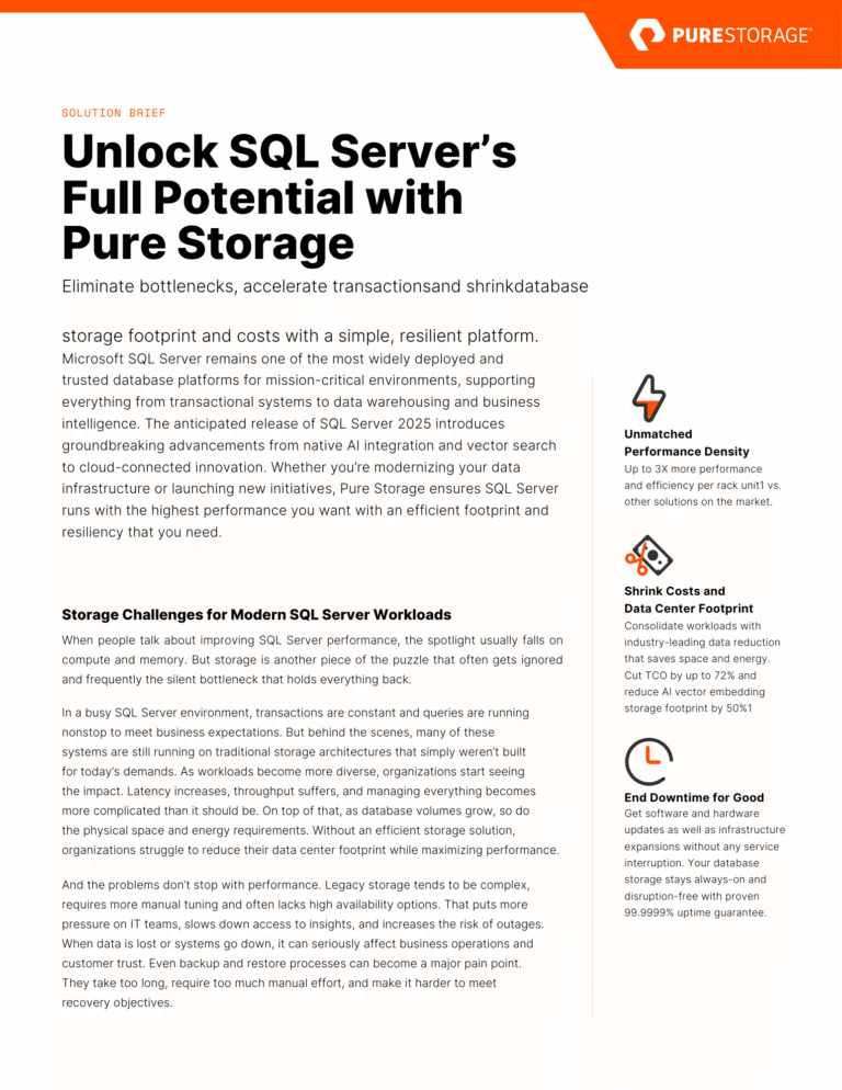 Microsoft SQL Server rimane una delle piattaforme di database più diffuse e affidabili per ambienti mission-critical, supportando tutto, dai sistemi transazionali al data warehousing e all’intelligenza aziendale. Il rilascio previsto di SQL Server 2025 introduce innovazioni rivoluzionarie, dall’integrazione nativa dell’intelligenza artificiale e la ricerca vettoriale, fino all’innovazione connessa al cloud. Che tu stia modernizzando la tua infrastruttura dati o avviando nuove iniziative, Pure Storage garantisce che SQL Server funzioni con le massime prestazioni desiderate, con un ingombro efficiente e la resilienza necessaria.